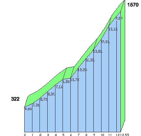 Se sale de Oviedo por la N-630. Esta carretera es excelente para el cicloturismo ya que se trata de una carretera poco transitada y con arcenes amplios. Tras unos 4 kilometros de toboganes se inicia una bajada de más de 2 kilometros que nos conducen a la central de Soto de Ribera. Despues de un tramo llano e inmediatamente despues de atravesar un túnel nos desviamos a la derecha hacia Riosa por la AS-231. Esta carretera es bastante estrecha para el tráfico que soporta con lo que combiene tener cuidado. A partir de aqui la carretera empieza a subir ligeramente. Tras atravesar la Foz, llegamos a la Vega donde se toma una desviación a la derecha en donde se inicia la subida. Los 6 primeros kilometros no destacan por su dureza (sobre el 7%) y al llegar a un area recreativa hay una zona de falso llano. Tras atravesar este tramo es donde empieza la impresionante dureza de esta subida, que en los siguientes 6 kilometros y medio tiene un desnivel medio de más del 13%, es aqui donde nos encontramos el primer muro del 19% durante una zona de curvas en herradura. Sin embargo la parte más dura esta a kilometro y medio de la cima con una impresionante rampa que llega a alcanzar el 22% durante 300 metros que se hacen interminables. Es en esta parte de la ascensión donde nos encontramos con unas vistas impresionantes que llegan, en días despejados, hasta la costa, a casi 50 kilometros de distancia. La carretera está bien, se asfaltó en su tramo final hace unos meses, y presenta unas revueltas que contribuyen a aumentar la espectacularidad de la subida. Tras coronar, la carretera sigue unos cientos de metros más para morir en una preciosa vaguada rodeada de cabaña donde en verano pastan las vacas de la raza asturiana de los valles. En resumen se puede afirmar que esta subida, además de una impresionante dureza presenta unos paisajes y vistas espectaculares. Para regresar no hay más remedio que deshacer el camino andado, hasta al menos Las Segadas, donde se puede cocer un tren que nos lleva a Oviedo, evitandonos los últimos 6 Kilometros que se hacen bastante duros despues del gran esfuerzo realizado. Hay que tener mucha precaución en la bajada ya que es francamente peligrosa con curvas muy cerradas y con unas pendientes muy pronunciadas. | |||||||||||||||||||||||